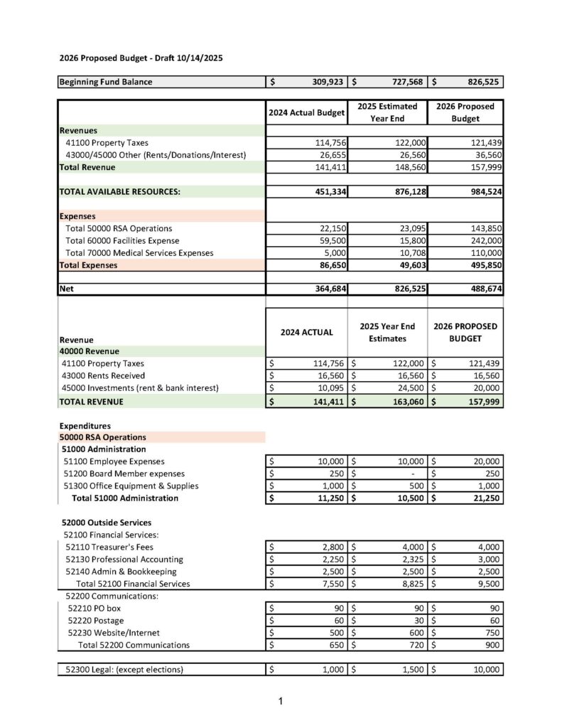 FURTHER NOTICE IS HEREBY GIVEN that the Ouray County Regional Service Authority will conduct a Public Hearing to consider the proposed budget at a regular RSA Board of Directors meeting, to be held at the Ridgway Public Library in Ridgway, Colorado, at 12:30pm on November 18, 2025.