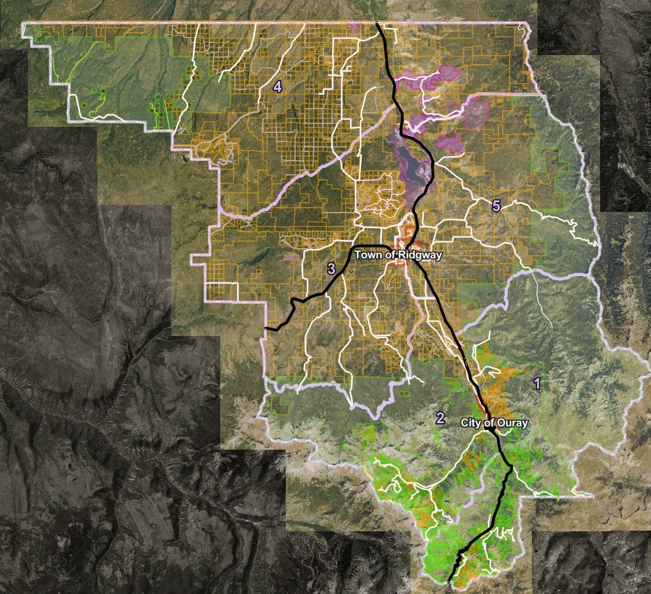 District 5 (Precinct 5): Central portion of the county largely east of US 550, but including portions of the Town of Ridgway